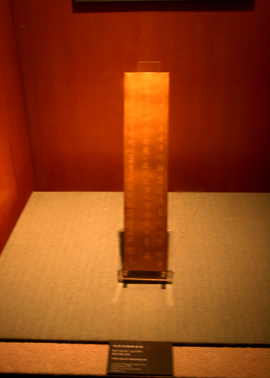 河南博物院的“鎮(zhèn)館之寶”之二的唐武則天除罪金簡。它是武則天在久視元年(公元700年)7月7日到嵩山祈福,譴宮廷太監(jiān)胡超向諸神投簡以求除罪消災(zāi)。這是中國目前發(fā)現(xiàn)的唯一金簡。
