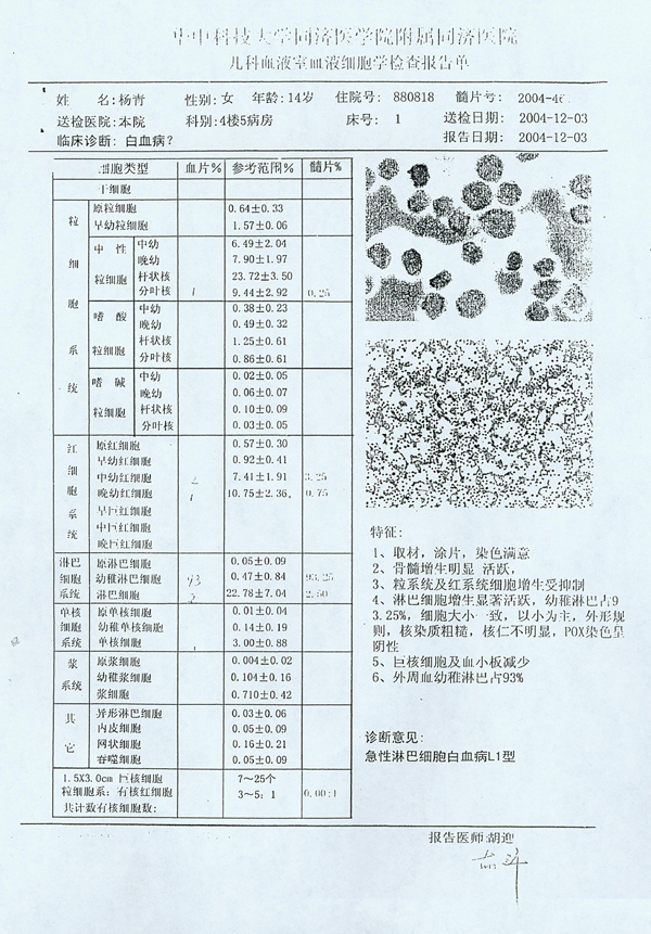 楊青血液細胞學(xué)檢查報告單(圖)
