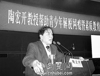 一襲并不時(shí)尚的米色風(fēng)衣,一套普通的深色西裝,中等身材,高額闊臉,面色健康,頭發(fā)略有花白。快人快語(yǔ),不時(shí)夾雜幾句“Yes”“No”,講到激動(dòng)處有些口吃。這便是“青少年網(wǎng)絡(luò)愛(ài)心大使”、59歲的華中師范大學(xué)特聘教授陶宏開(kāi)。從間接了解,到直接接觸,從報(bào)告會(huì)、座談會(huì),到面對(duì)面采訪,連日來(lái),記者就這樣走近陶宏開(kāi)——