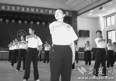 昨日下午,湖北省衛(wèi)生系統(tǒng)直屬11家醫(yī)院派出代表隊,參加全省舉辦的第九套廣播體操比賽。據(jù)介紹,新體操在傳統(tǒng)廣播體操的基礎(chǔ)上,引入了武術(shù)、踢毽等元素,可有利促進(jìn)全身循環(huán)、精神傳導(dǎo)等。圖為省腫瘤醫(yī)院代表隊在表演。