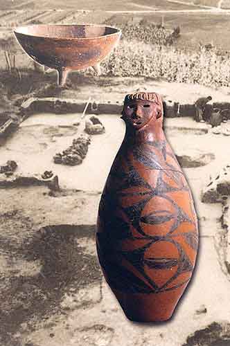 人面形平底彩陶瓶:水器(下,高31.8厘米)