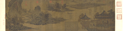 此圖是一幅山水人物畫,畫卷的開首部分便是吳興南園一角,主體建筑為一座重檐歇山頂?shù)臉情w,相配小亭欄桿回環(huán)曲折,花草樹木掩映,庭中有鶴,亭角有花一株,環(huán)境幽雅而氣象恢宏。樓閣內(nèi),馬太守正陪二老對坐奕棋;小亭內(nèi),二老手扶欄桿,一面賞景一面閑話;另二老或攜琴或曳杖,款款而來。此外有童仆衙役陪伴侍候。這是一次風流儒雅的集會,輕松愉快,表現(xiàn)出一派太平盛世的氣氛。這一段表現(xiàn)了三首詩的內(nèi)容,除前述一首之外,另有《庭鶴》、《玉蝴蝶花》二首