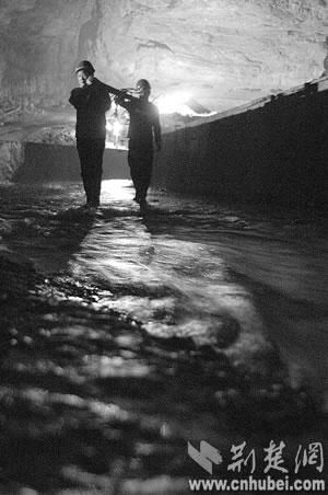 寂寞的蝙蝠第一次接待了人間來客,沉睡萬年的巖溶洞穴第一次迎來了觀者。但黑暗陌生的世界還是讓堂堂男兒們感覺了一絲陰森恐怖。他們曾聽當?shù)匕傩諅髡f,洞里有巨蟒,所以至今沒人敢進洞!白ゾo時間測量!”來不及恐懼,他們?yōu)樽约汗膭,因為這里隨時可能發(fā)生漲水、墜落等危險?上,第一次經(jīng)驗不足,手電筒的電池很快用完了,一行人只得互相攙扶著,摸索出溶洞。“后來,我們又進去了7次,終于測出了暗河的具體位置和流向!狈轿奈湔f。