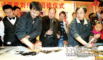 12點,比拼結(jié)束,張俁俁、萬正濤、武大學(xué)生張艷平等10人順利地成為劉偉新的入室弟子。“他們年輕、書畫功底扎實,看來我的掌畫將后繼有人。”劉偉新一臉笑意。