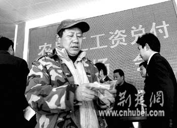 2日,湖南籍在鐘祥市境內(nèi)某高速公路務工的農(nóng)民工在鐘祥市勞動監(jiān)察大隊領到了他們的工資。近年來,鐘祥市勞動和社會保障局著重建立和完善農(nóng)民工權(quán)益保障制度,經(jīng)常在全市開展勞動用工專項檢查,加大對農(nóng)民工工資支付監(jiān)控力度,從源頭上有效地控制了拖欠農(nóng)民工工資問題。(通訊員趙云福鐘國慶攝)