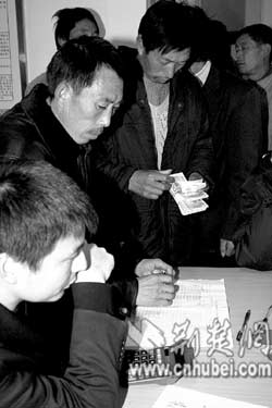 荊門麻城鎮(zhèn)譚珍國等農(nóng)民工,在天門市勞動保障監(jiān)察大隊領取用人單位所欠的工資款(上圖)。去年12月以來,天門市組織有關職能部門對全市37家用人單位支付農(nóng)民工工資情況進行專項檢查,共查出6家用人單位拖欠農(nóng)民工工資,他們及時為2056名農(nóng)民工追回工資180余萬元(下圖)。(特約記者肖金舫通訊員劉銀斌攝)