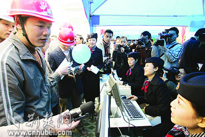 像譚梅一樣,昨天共有300多名農(nóng)民工涌到武漢市總工會大院,參加了在這里舉行的武漢市農(nóng)民工“平安返鄉(xiāng)”票務(wù)趕集會。在武漢市總工會組織下,漢口火車站、傅家坡長途汽車站、武漢港務(wù)集團(tuán)客運(yùn)站等7家客運(yùn)單位,紛紛來到趕集會現(xiàn)場,為農(nóng)民工提供熱情的票務(wù)服務(wù)。
