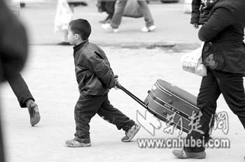 昨日,武昌火車站進站口,快樂的小方樾幫大人拖著行李箱(上圖)。