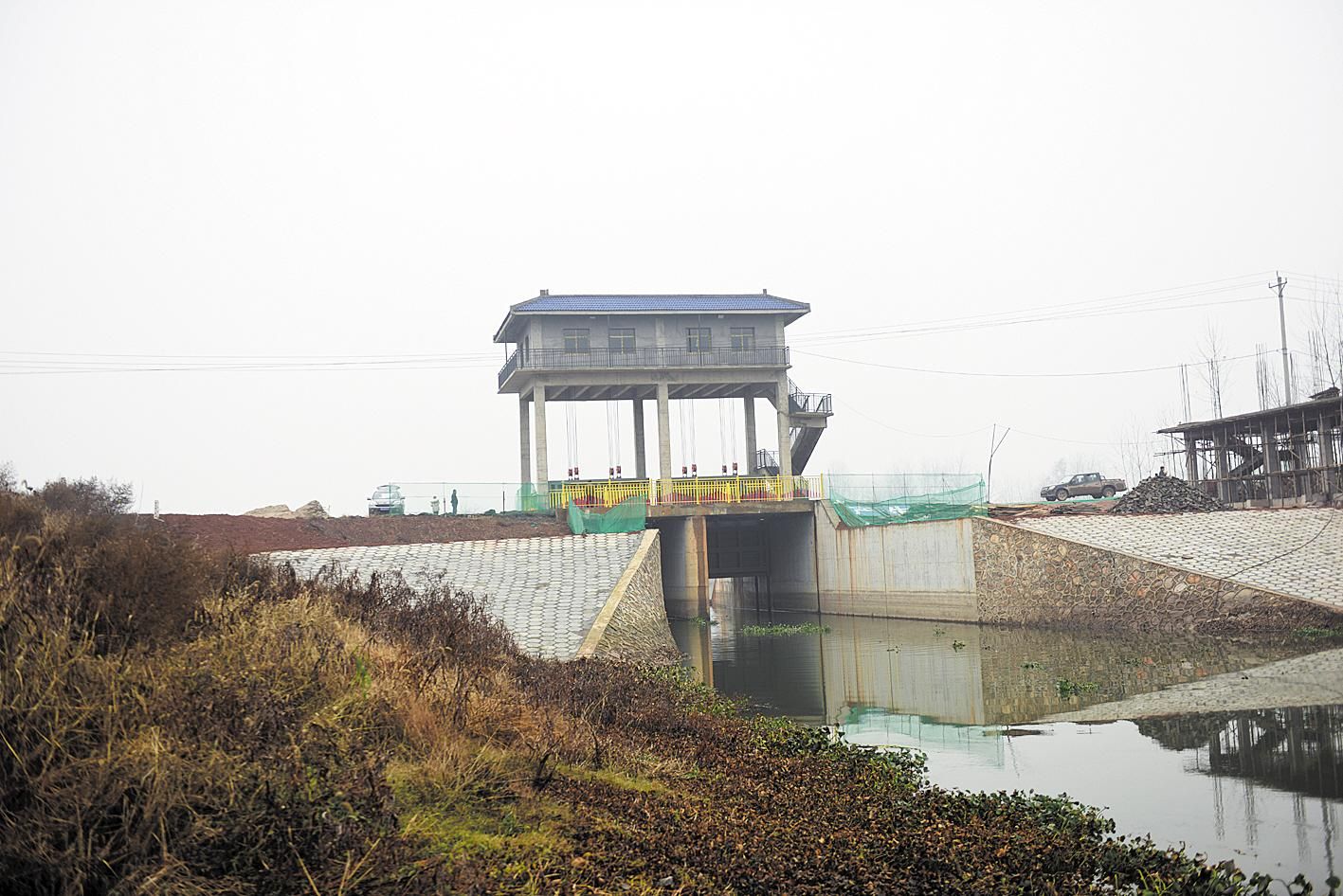 斧頭湖湖堤加固后,堤上閘站修整一新。
