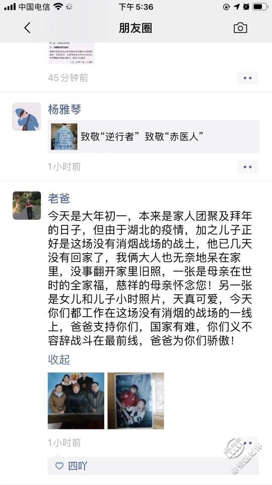 “國家有難,你們義不容辭戰(zhàn)斗在最前線,爸爸為你們驕傲,爸爸支持你們。”這是市人民醫(yī)院呼吸內科住院醫(yī)師姚威的爸爸發(fā)的朋友圈內容。這位爸爸也和大家一樣,既擔心兒子的安危,卻也為兒子感到驕傲和自豪。