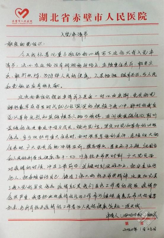 “今天我懷著無比激動的心情寫下這份入黨申請書,決心在這場沒有硝煙的戰(zhàn)場上,不畏犧牲,挺身而出?!边@是來自市人民醫(yī)院90后呼吸內科住院醫(yī)師姚威的入黨申請書。
