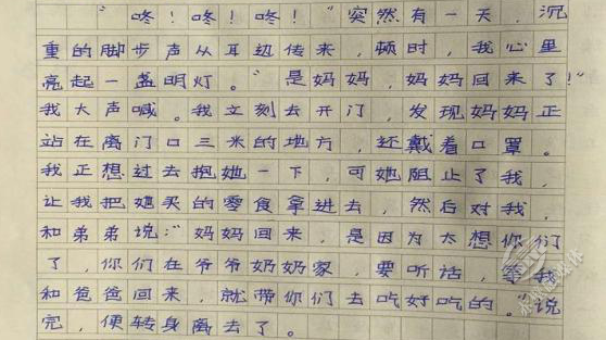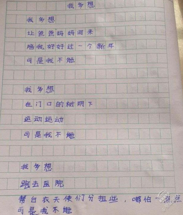 夫妻倆的大寶二寶,被托付給爺爺奶奶照料。多日不見父母,他偷偷寫下一首詩《我多想》:“我多想,讓爸爸媽媽回來,陪我好好過一個新年,可是我不能……我多想,跑去醫(yī)院,幫白衣天使分擔(dān)一些,哪怕一點(diǎn)點(diǎn),可是我不能……”字里行間,流溢出滿滿的思念。