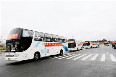 3月30日上午9時30分,在通山縣文體中心,12輛 “點對點、一站式”輸送返“粵”務工人員的愛心大巴專車,載著320名務工人員一路向南,前往深圳等地返崗復工,這是目前咸寧市人數(shù)最多的一次“點對點”輸送。