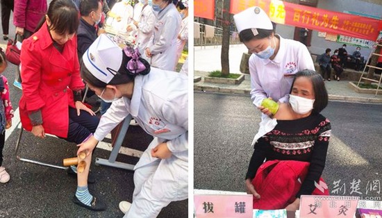 在中醫(yī)適宜技術(shù)體驗區(qū),社區(qū)居民在體驗拔罐、艾灸項目。通訊員供圖