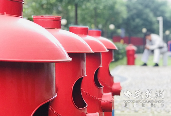 消防元素十足的垃圾桶。(呂鑒蕾 攝)