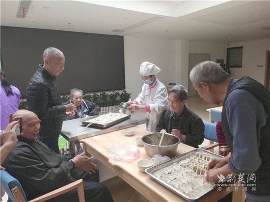 養(yǎng)護院內(nèi)的老人們圍坐在一起其樂融融的包餃子。熊子璇 攝