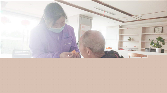 這樣溫馨的情形在養(yǎng)護院內(nèi)隨處可見。今年85歲的阮爺爺雖患有阿爾茲海默癥,但依舊忘不了夸贊這里的護理人員,“我對你們個個都好喜歡?!比顮敔斃o理員的手,開心地說。
