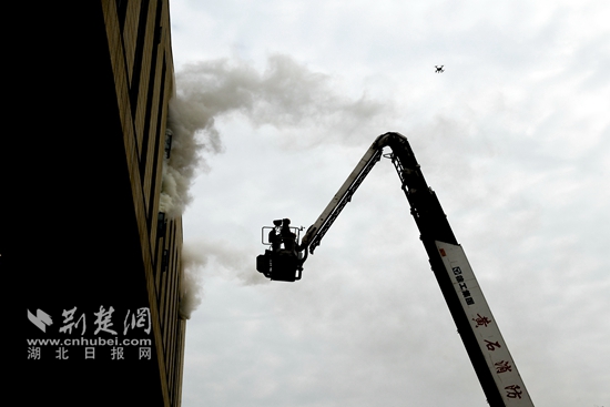 圖為滅火救援實戰(zhàn)演練,舉高噴射消防車向“受困”群眾展開救援。通訊員供圖