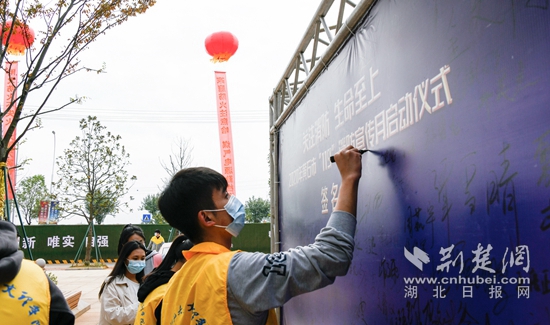 大學(xué)生志愿者在簽名墻上留言。通訊員供圖