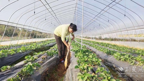 在草莓大棚做工的貧困戶王友珍。熊子璇 攝