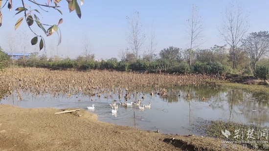 在基地魚塘內(nèi)養(yǎng)的鵝。記者 熊子璇 攝