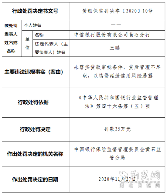 公告稱,中信銀行黃石分行因未落實貸款審批條件,貸后管理不盡職,以續(xù)貸延緩信用風險暴露的違規(guī)行為,依據(jù)《中華人民共和國銀行業(yè)監(jiān)督管理法》第四十六條第(五)項,中信銀行黃石分行對其作出罰款人民幣25萬元的行政處罰決定。