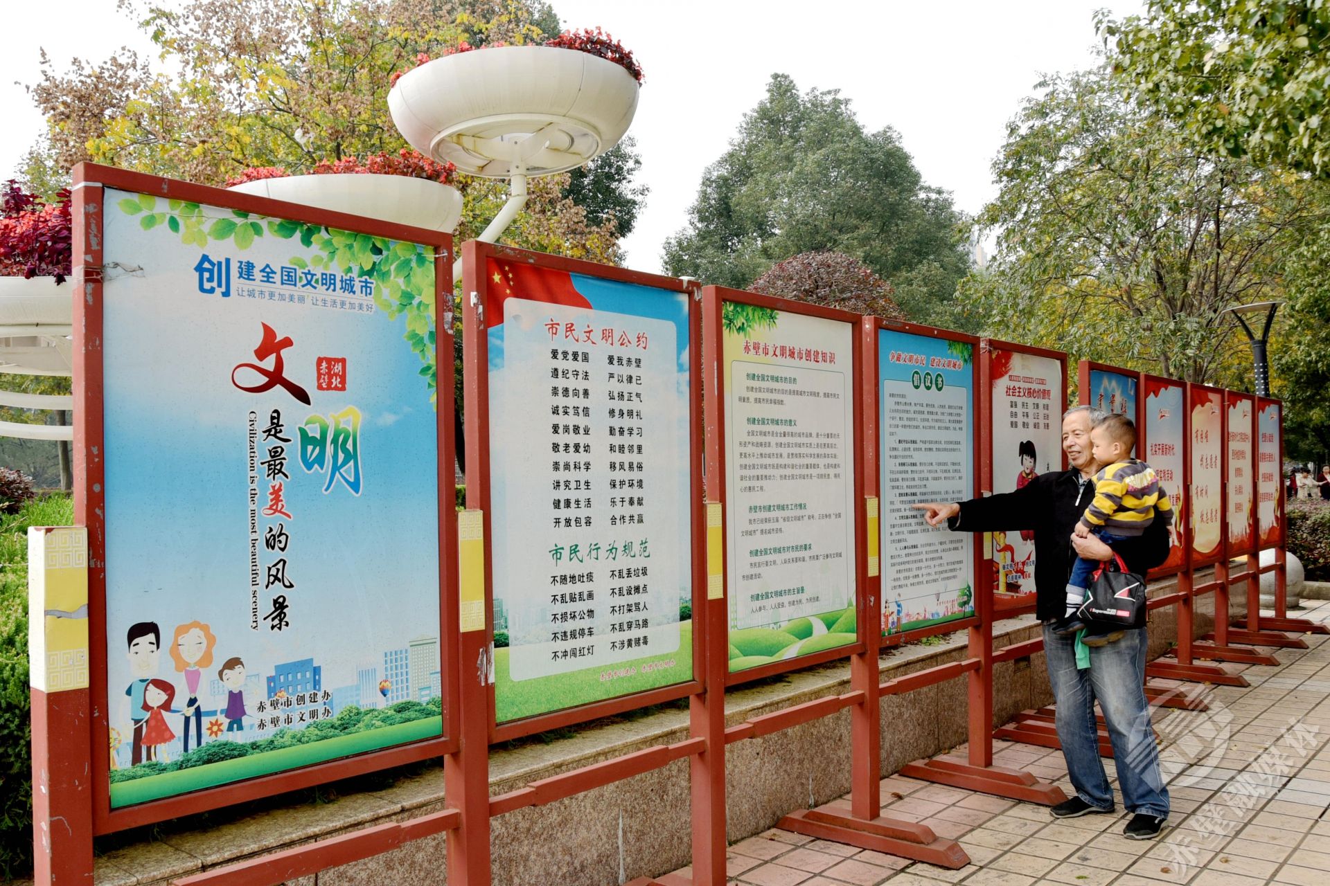 “今天帶孫子出來轉(zhuǎn)轉(zhuǎn),抬眼就看到這個,正好教孫子認認字?!?0月29日,溜彎在人民廣場的羅爺爺指著文明創(chuàng)建宣傳展板開心的對記者說。