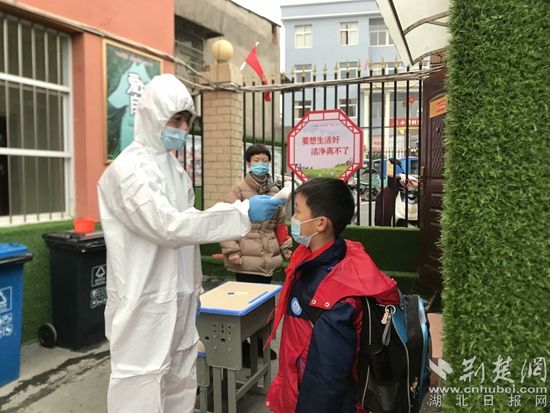 圖為:學(xué)生進(jìn)校測(cè)體溫。通訊員 供圖