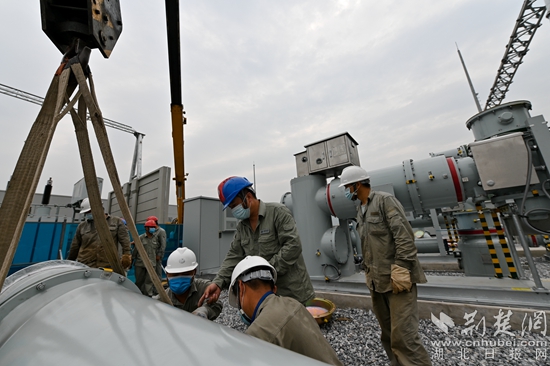施工人員在吊裝變電站供電設(shè)備。(通訊員 供圖)