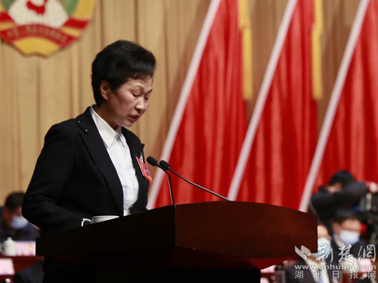 周蔚芬作《政協(xié)黃石市第十三屆委員會常務(wù)委員會工作報告》。金康 攝
