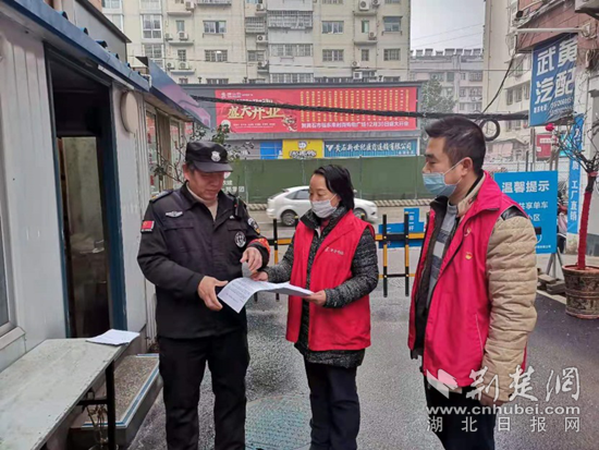 下沉黨員和社區(qū)工作隊(duì)員一起到小區(qū)門崗查詢外來(lái)人員體溫測(cè)量記錄。(師院社區(qū)供圖)