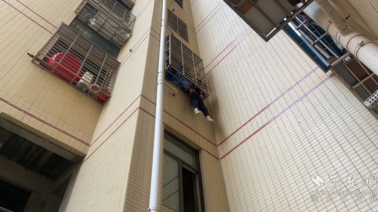 消防指戰(zhàn)員到場后發(fā)現(xiàn),男童被困在居民樓5樓窗外的防盜網(wǎng)外側(cè),腳下沒有任何緩沖支撐物。熱心鄰居正蹲在防盜網(wǎng)上緊緊抱住孩子腰部,二人都身處窗外無法動彈,情況十分危急。