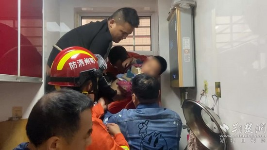 荊楚網(wǎng)(湖北日報網(wǎng))訊(通訊員 黃劍雙、徐博文)2月18日17時許,鄂州市一名5歲左右男童在家中廚房玩耍時,爬上5樓窗外,被卡在防盜網(wǎng)上,隨時有墜落危險。所幸3樓鄰居及時發(fā)現(xiàn)并報警,鄂州消防接警后立即趕赴現(xiàn)場,經(jīng)過5分鐘左右的緊急救援,成功將男童救下。