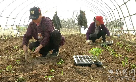位于黃梅縣新開鎮(zhèn)渡口下村農(nóng)富園蔬菜種植合作社的蔬菜大棚里,工人們正在搶栽辣椒苗。通訊員供圖