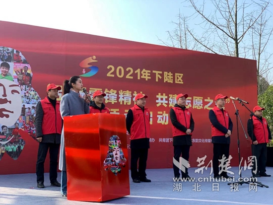 黃石市退役軍人志愿者先鋒隊(duì)隊(duì)長(zhǎng)呂東宣讀《“弘揚(yáng)雷鋒精神共建志愿之城”倡議書(shū)》。(通訊員供圖)