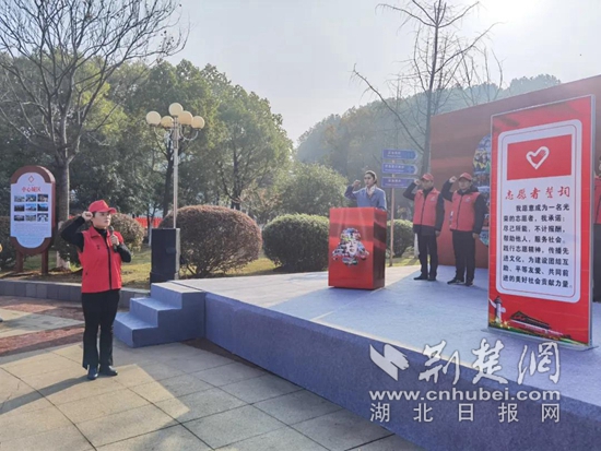 下陸區(qū)“與愛(ài)同行”義工協(xié)會(huì)會(huì)長(zhǎng)潘潔領(lǐng)讀《志愿者誓詞》。(通訊員供圖)