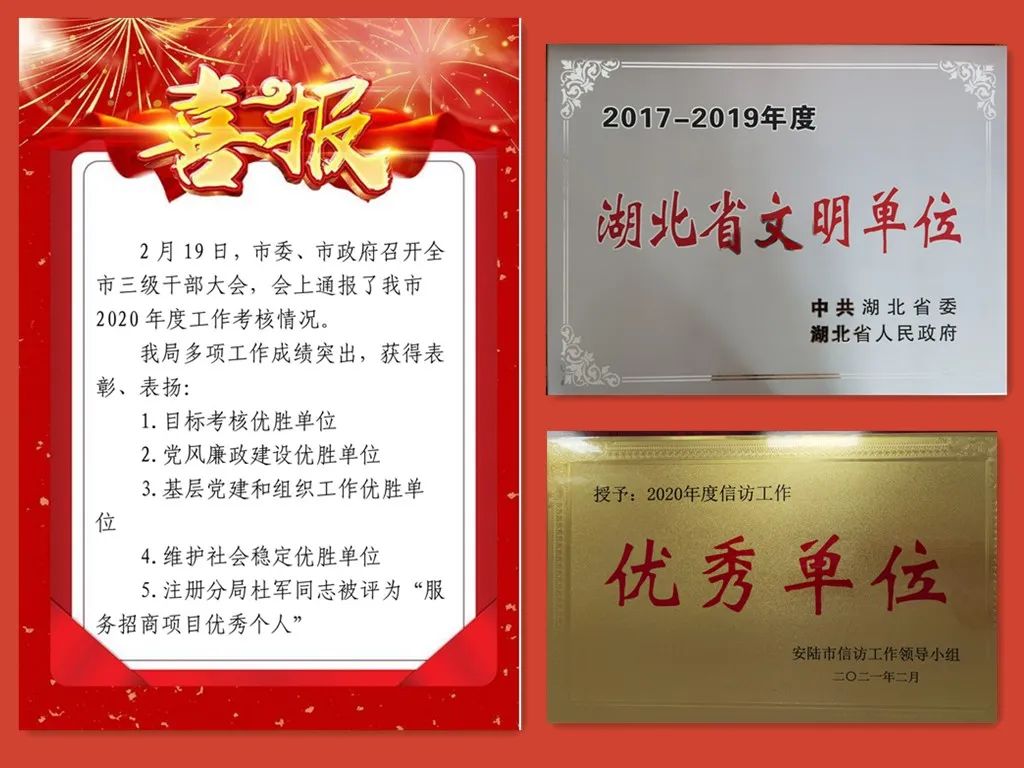 2020年,安陸市市場(chǎng)監(jiān)督管理局被省委、省政府表彰為“省級(jí)文明單位”,被省消委會(huì)評(píng)為“消費(fèi)維權(quán)先進(jìn)集體”,被省知識(shí)產(chǎn)權(quán)局評(píng)為“打擊知識(shí)產(chǎn)權(quán)違法百日?qǐng)?zhí)法行動(dòng)業(yè)績(jī)突出單位”,被孝感市委、市政府評(píng)為“抗擊新冠肺炎疫情先進(jìn)集體”,被安陸市委、市政府評(píng)為“目標(biāo)考核優(yōu)勝單位”。