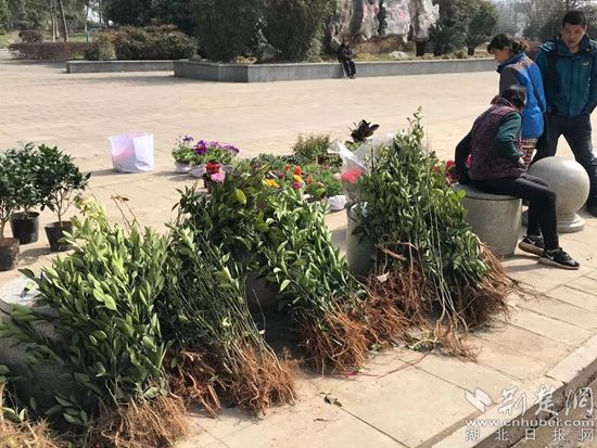 3月7日上午,黃顙口鎮(zhèn)轉(zhuǎn)盤處的一苗木臨時(shí)售賣處,各種花卉苗木堆放在濱江廣場旁,前來選購的農(nóng)民群眾正在精挑細(xì)選。苗木經(jīng)營者尹忠貴正在給前來選購的群眾介紹花卉苗木的種植方法及養(yǎng)護(hù)要領(lǐng),將群眾選好的苗木綁扎好并修剪多余的枝條。