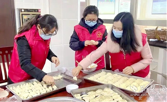 志愿者為老人包餃子。(通訊員供圖)