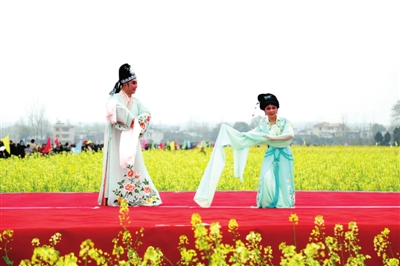精彩的文藝演出、極具地方風情的民俗表演和國家非物質(zhì)文化遺產(chǎn)提琴戲演唱,與花海交相輝映,為大家?guī)砹艘暵犑⒀纭i_幕后,游客開始游玩賞景,大家邊感嘆七彩油菜花的美,邊呼朋引伴拍照留念,人花相映襯,美不勝收。除了賞花,大家還紛紛品嘗特色美食,購買當?shù)靥厣r(nóng)產(chǎn)品。