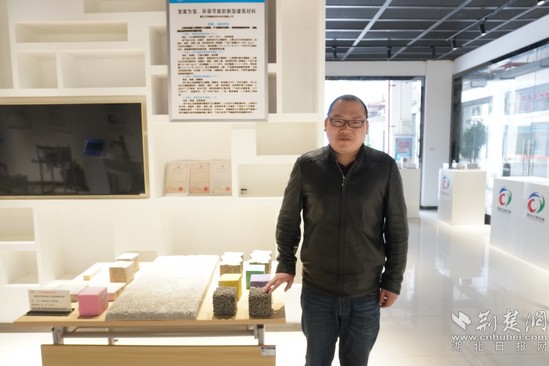 陸成龍向記者介紹新型綠色建筑材料。記者 熊子璇 攝