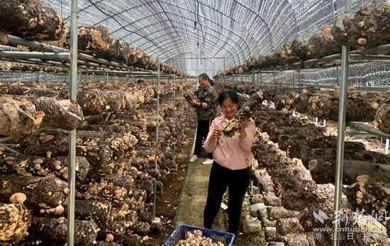 麻城市閻家河鎮(zhèn)桃林河香菇基地,務(wù)工人員采摘香菇。通訊員供圖