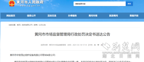 荊楚網(wǎng)(湖北日?qǐng)?bào)網(wǎng))訊(記者 熊子璇)3月18日,黃岡市人民政府網(wǎng)發(fā)布一則《黃岡市市場(chǎng)監(jiān)督管理局行政處罰決定書送達(dá)公告》,“一口氣”對(duì)504家公司作出吊銷營(yíng)業(yè)執(zhí)照的行政處罰。