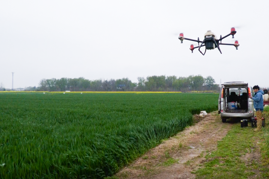 無人機(jī)給麥地噴灑藥劑 陳玉瑩攝