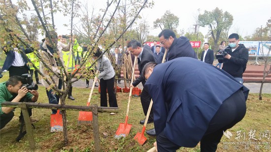 黃石市領(lǐng)導(dǎo)與江蘇援黃醫(yī)療隊(duì)代表團(tuán)一同為紀(jì)念林里的苗木培土。阮瓊 攝