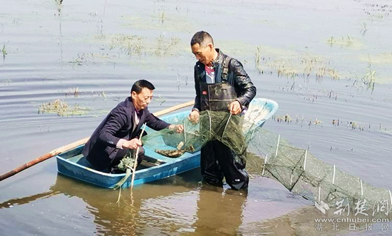 小池鎮(zhèn)楊垏村承包60畝蝦稻連作的農(nóng)民程自力(右)涉水取蝦籠。通訊員供圖