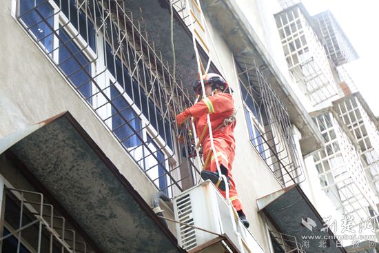 消防員第一時間趕到現(xiàn)場,報警人成先生家是一棟四層自建房,小女孩被鎖在3樓,成先生的妻子在門口急得團(tuán)團(tuán)轉(zhuǎn)。經(jīng)過一番偵察,消防員發(fā)現(xiàn)三樓窗子的防盜網(wǎng)可以打開,在征得住戶同意后,便拿來消防軟梯并做好安全防護(hù),在其他隊友的幫助下,消防員化身“蜘蛛俠”從四樓頂降至3樓窗戶口,站在窗戶外的空調(diào)機(jī)上,利用角磨機(jī)將鎖打開,順利進(jìn)入房間,僅用20分鐘就成功開門將小女孩救出。
