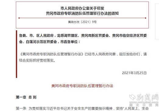 據(jù)悉,這是湖北省首個地級市出臺的有關(guān)專職消防隊(duì)伍管理的規(guī)范性文件,是黃岡市為進(jìn)一步規(guī)范城市政府專職消防隊(duì)伍建設(shè)和管理,提高隊(duì)伍滅火救援和火災(zāi)預(yù)防能力,根據(jù)國家標(biāo)準(zhǔn)結(jié)合本市實(shí)際制定的。