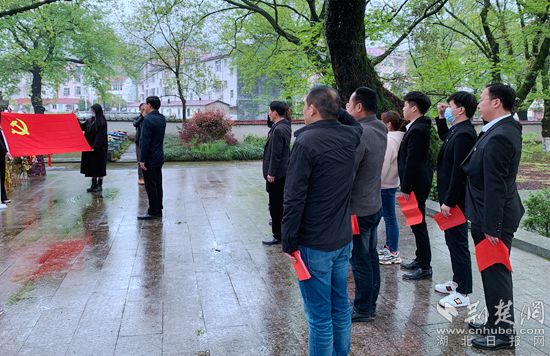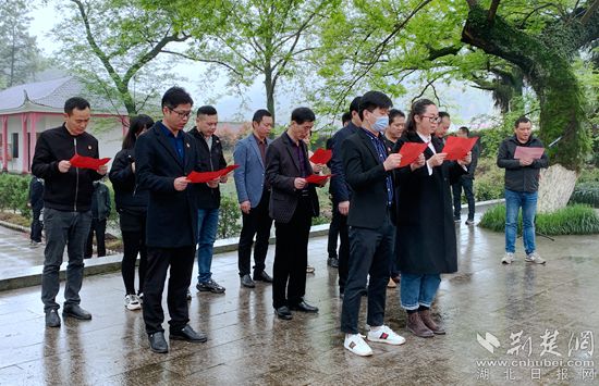 蒙蒙細(xì)雨中,青松翠柏掩映下的烈士陵園莊嚴(yán)、肅穆。全體黨員身著正裝佩戴黨徽,向革命烈士紀(jì)念碑進(jìn)獻(xiàn)花籃并默哀。“一心只愛(ài)共產(chǎn)黨,哪管他人道短長(zhǎng)!我一歌兮歌聲揚(yáng),碧血千秋吐芬芳……”全體黨員齊聲朗誦黃梅籍革命英烈王達(dá)強(qiáng)的詩(shī)歌《七歌》,牢記烈士遺志。