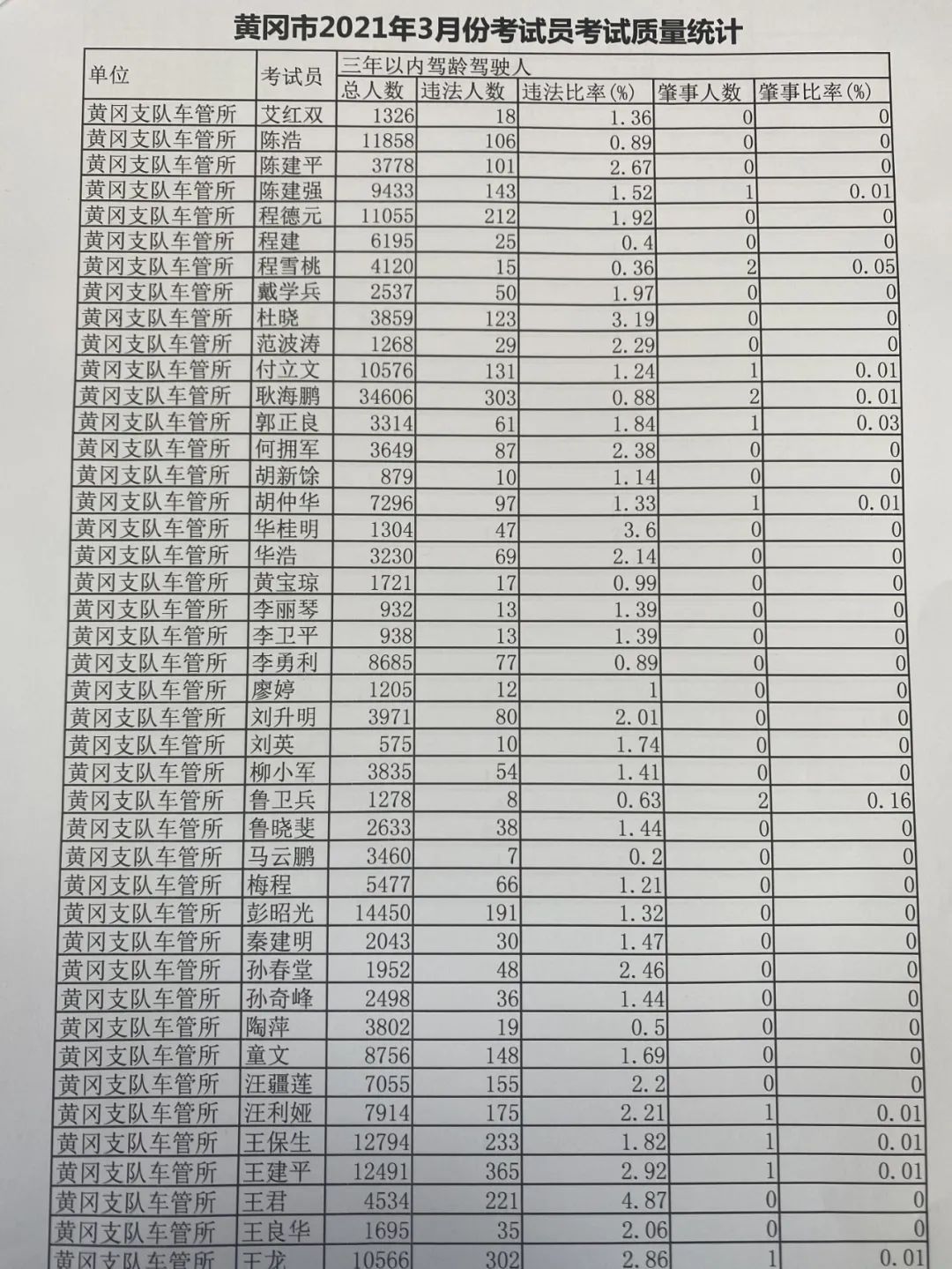 荊楚網(wǎng)(湖北日報網(wǎng))訊(記者劉璐)4月6日,記者從黃岡市公安局交通警察支隊獲悉,2021年3月黃岡市駕校培訓質(zhì)量及考試員考試質(zhì)量統(tǒng)計表公布。通過一覽表,市民可看到黃岡73家駕校培訓質(zhì)量以及77名考試員考試質(zhì)量。